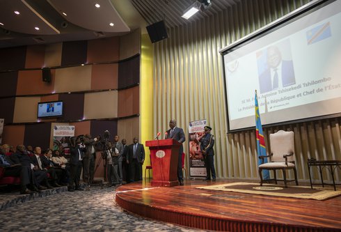 Dr. Victor Kande gives remarks at a National HAT Day ceremony in Kinshasa where the fellowship was announced. Dr. Kande has spent more than 40 years of his life working to eliminate HAT. Photo taken pre-COVID-19: PATH/Sylvain Baloji.