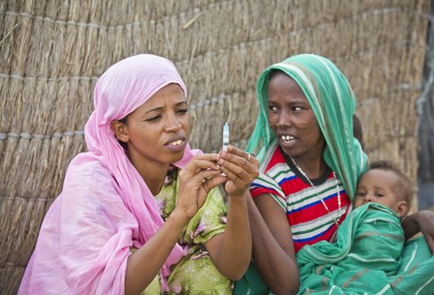 Mothers and children gather at a newly renovated health post in Afar Region, where essential vaccination services have resumed. Photo: PATH/Saba Ermyas.