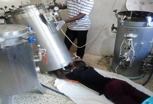 A biomedical engineer in Senegal services a pressure swing adsorption oxygen generation plant. Photo: PATH/Conner House.